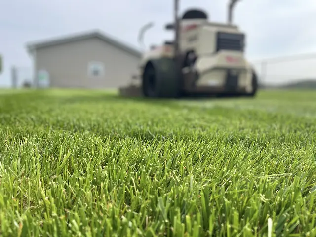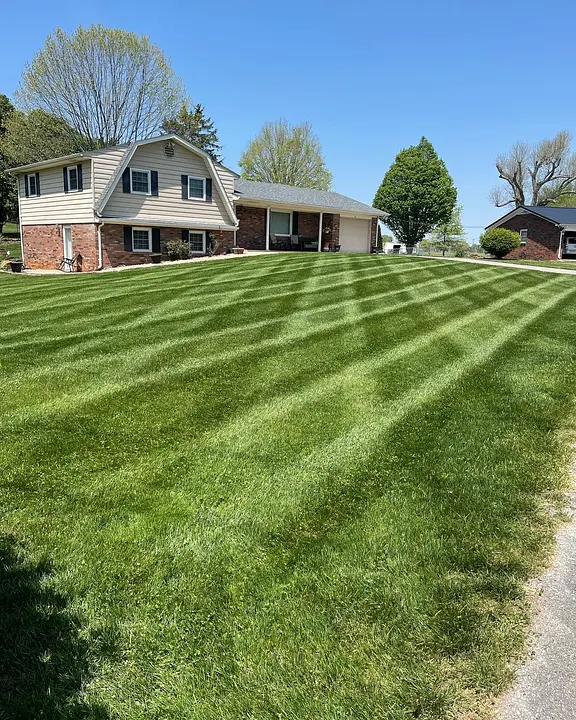 Regular mowing, edging, fertilizing, and overseeding to maintain a lush lawn.